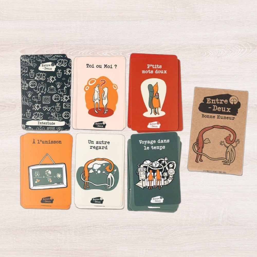 Câest ainsi quâest nĂ©e lâidĂ©e dâEntre-Deux. Lors de son dĂ©veloppement, une sĂ©rie de catĂ©gories et de questions ont Ă©tĂ© créées et Ă©valuĂ©es par nos utilisateurs-tests. Les idĂ©es qui ont obtenu la « note maximale » se retrouvent dĂ©sormais dans le jeu de cartes. Nous nous rĂ©jouissons de lire vos avis sur ce nouveau jeu.