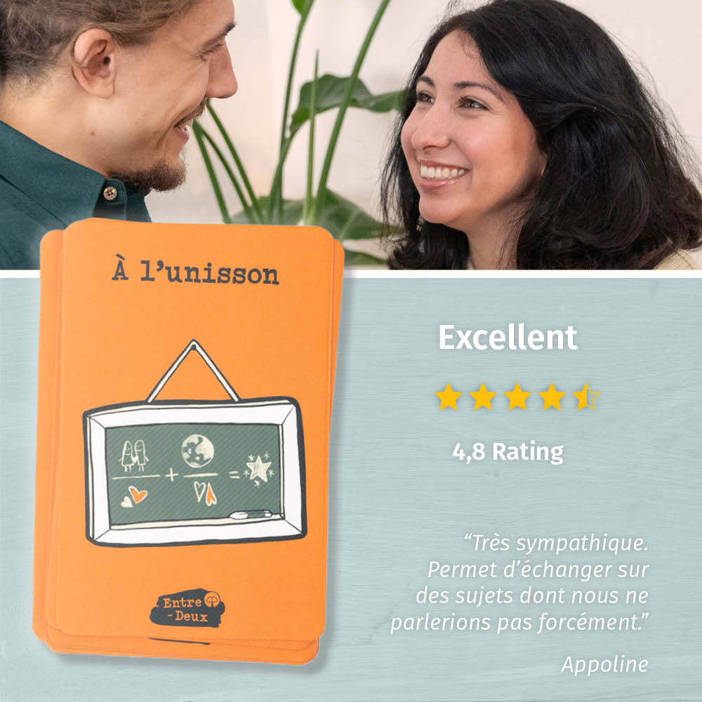 Le jeu de cartes Entre-Deux Bonne Humeur propose des Ă©changes drĂŽles et amusants. Il nây a pas dâinstructions compliquĂ©es, vous pouvez Ă tout moment commencer et interrompre ce jeu. Lâobjectif dâEntre-Deux nâest pas de gagner, mais de sâamuser ensemble et de partager un bon moment en couple.