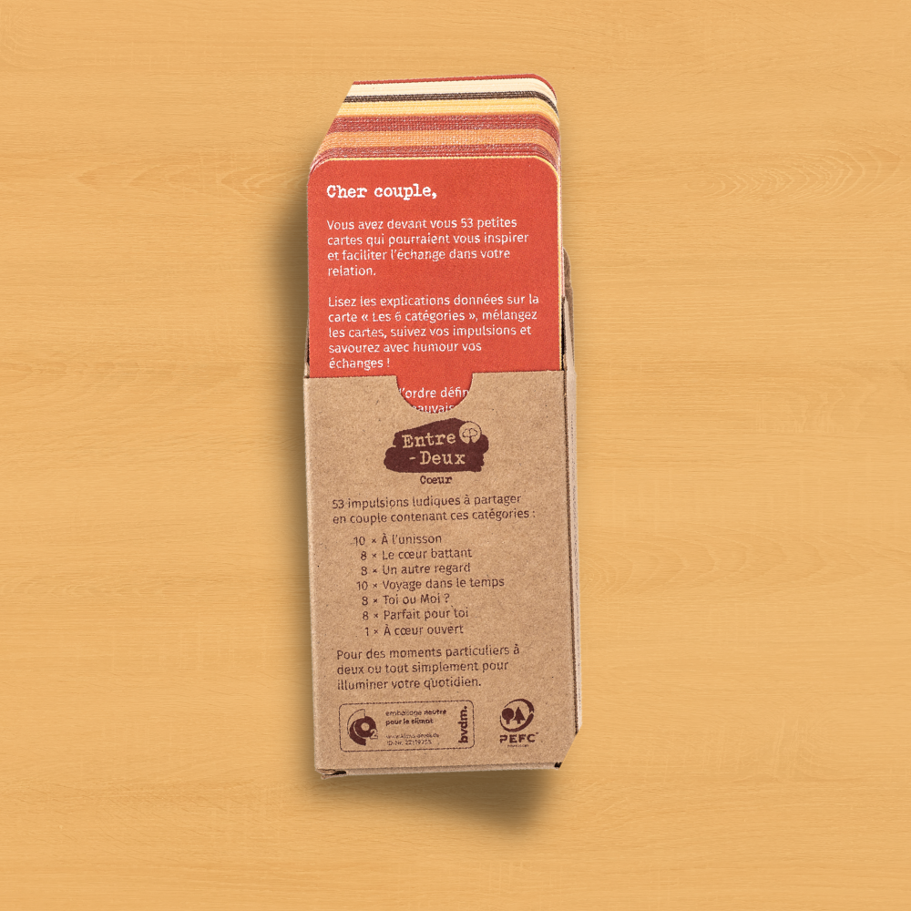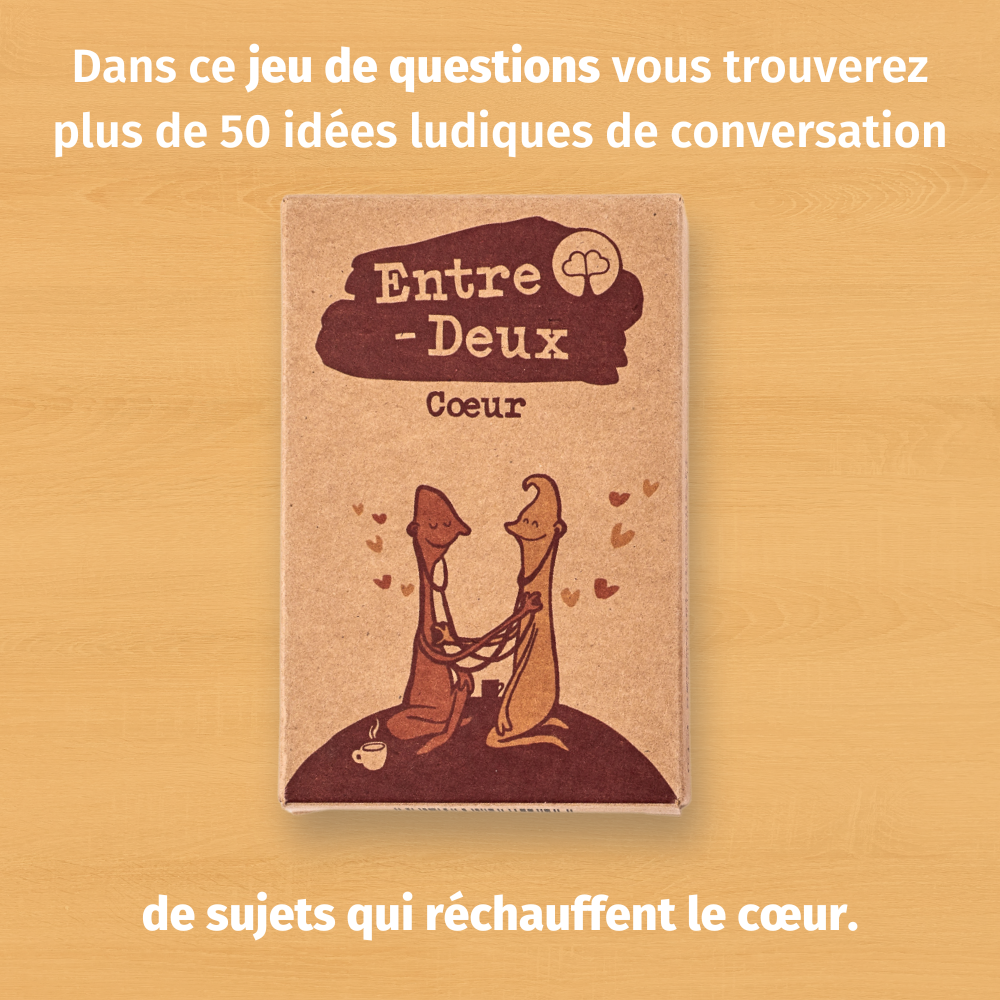 Le jeu de cartes Entre-Deux Cœur invite à partager des échanges spontanés en lien avec votre relation de couple. Le temps passé ensemble et l’estime mutuelle passent souvent inaperçus dans la vie trépidante du quotidien.