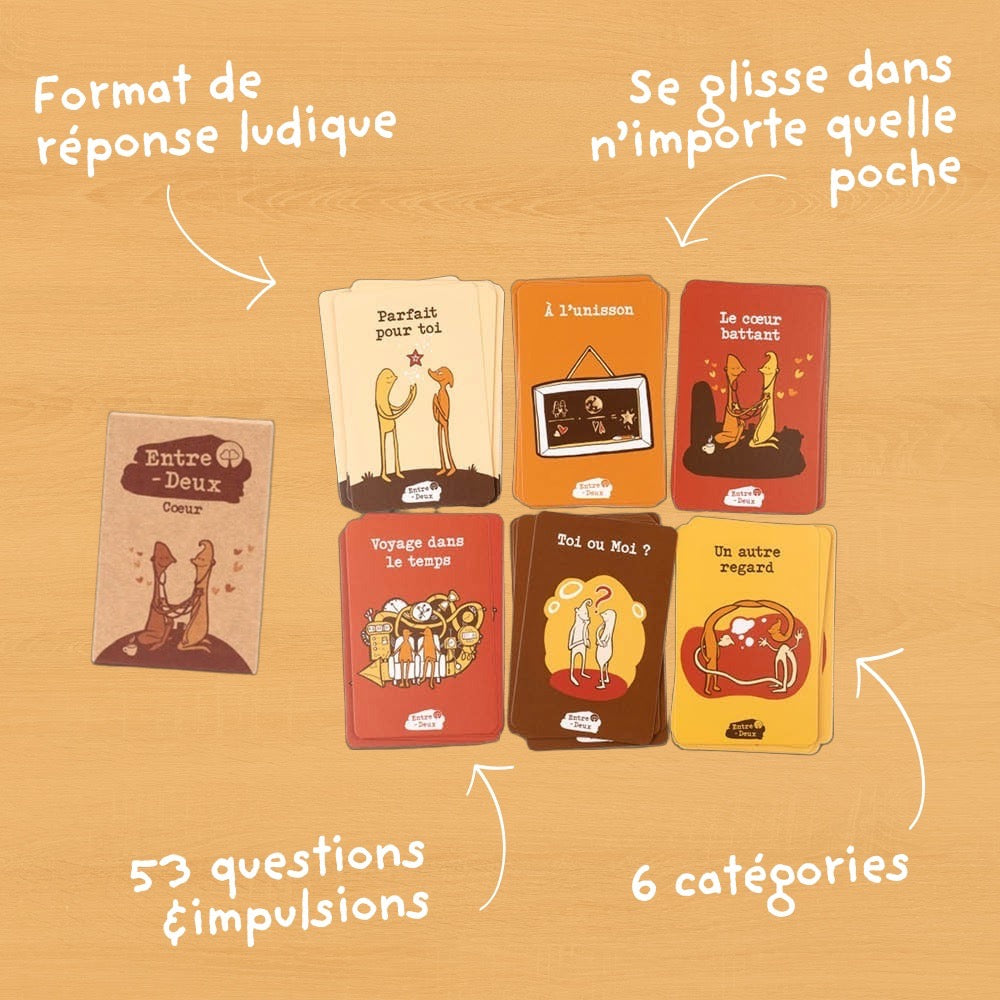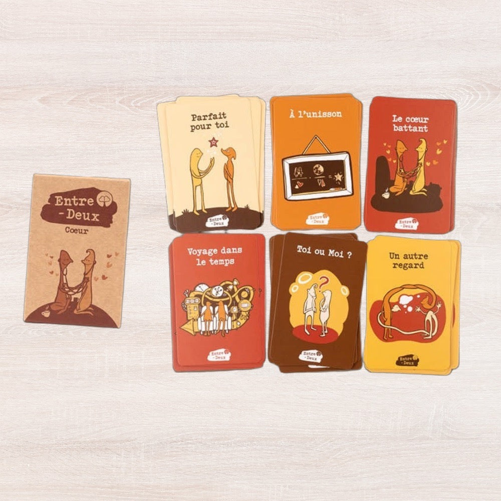 Le jeu de cartes Entre-Deux Cœur invite à partager des échanges spontanés en lien avec votre relation de couple. Le temps passé ensemble et l’estime mutuelle passent souvent inaperçus dans la vie trépidante du quotidien.