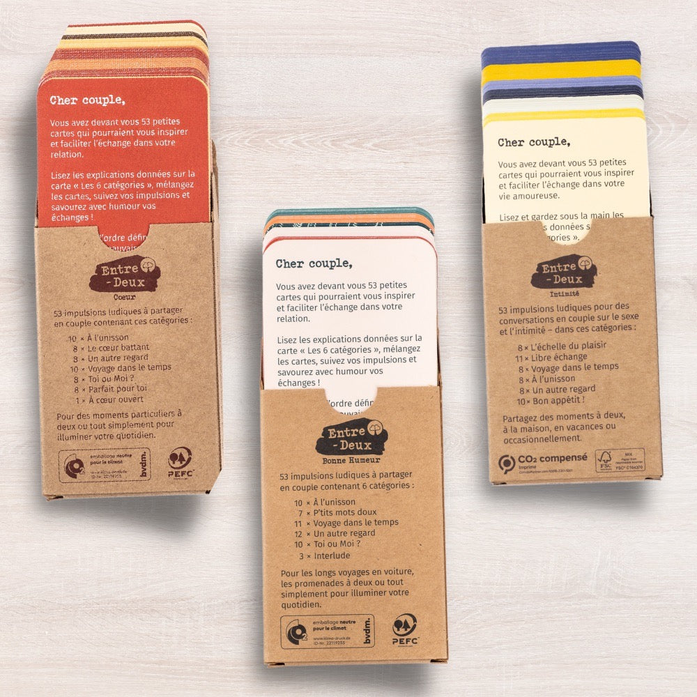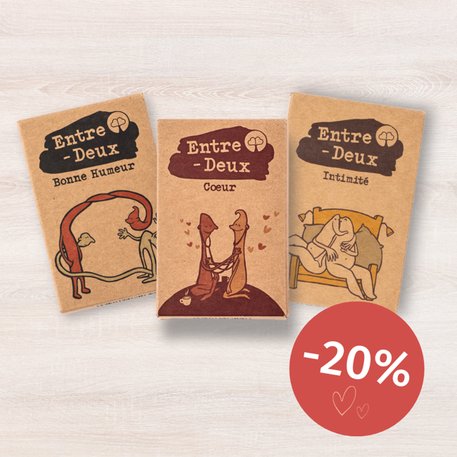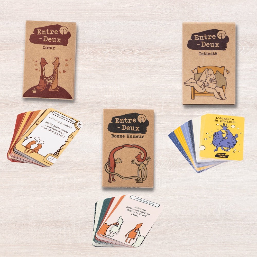 Notre offre Entre-Deux trio est exactement ce quâil vous faut. Chaque jeu contient 53 cartes diffĂ©rentes pour ouvrir le dialogue et partager des moments en couple.
